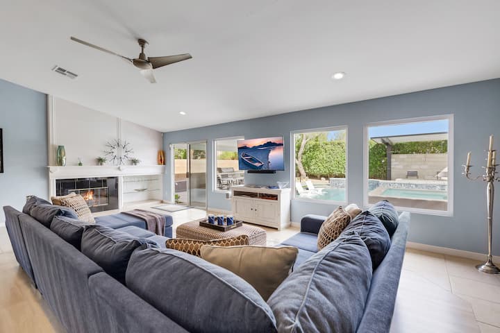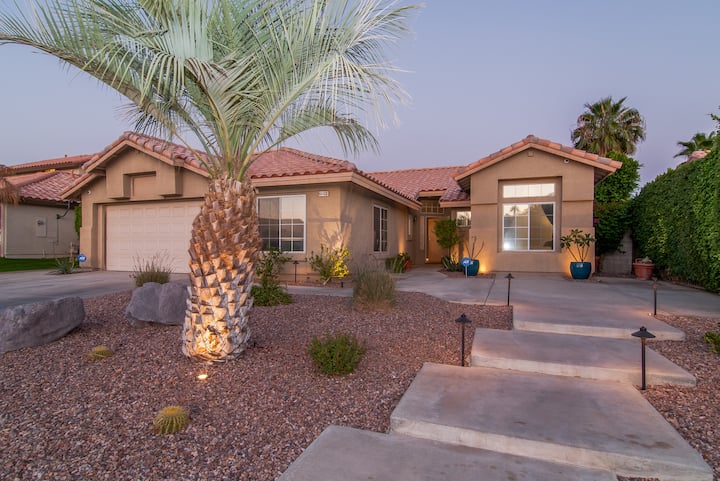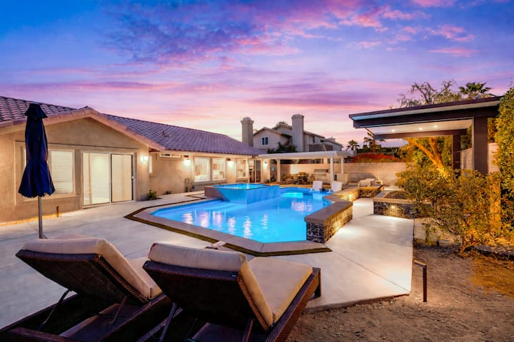 Your next desert dream vacation awaits at ‘Twin Palms’ featuring a Brand New (2026) 30 x 15 ft salt water pebble tech pool and infinity spa area with night-time atmospheric lighting, BBQ island, fire pit, large canopies with lighting, and inground Bose speakers for great outdoor entertaining. 'Twin Palms' is clean and comfortable with over 2000 sf of vacation space, 4 bedrooms/3 bathrooms, 600mbps Wi-Fi, and four 50” Smart TVs throughout the home. Close to many area attractions and shopping.