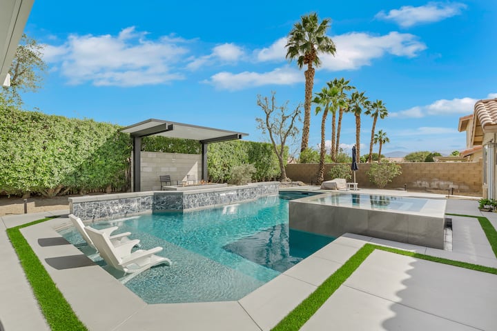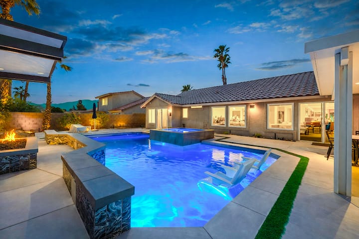 ‘Twin Palms’ features a fully redone 2026 back yard comes fully equipped with a large 30 x 15 ft foot long salt water swimming pool and an infinity spa (optional heating with rates below), lounge chairs to soak up the desert sun, umbrellas, pool toys, and wireless Bose Bluetooth speakers to soundtrack it all enjoying some of your favorite tunes. After a full day of activities you will be able to fire up the island grill with sink and side burner to bbq some of your favorite foods then later relax by the gas fire pit or chill in the infinity spa or pool with stunning views of the San Jacinto mountains afar while watching the stunning desert sunset.