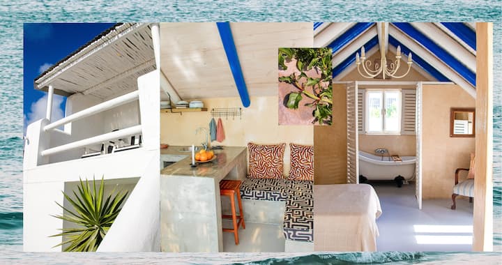 Our Top loft apartment is tucked away on the second floor. A cosy spot with a sweet little view in the sun. A braai that can be inside or outside on your private balcony if you just open the three glass doors, inviting the ocean into your kitchen while cooking. Take the ocean with you to the bedroom and authentic bathroom with Victorian tub along blue beams!