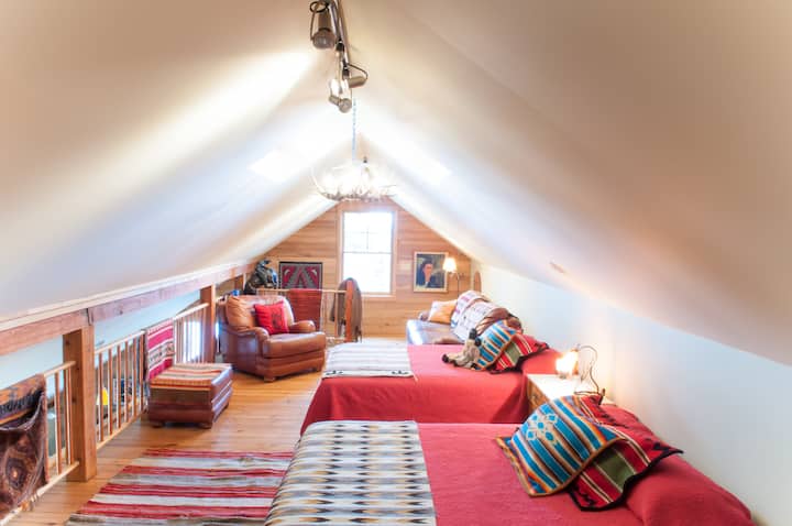 Inside, you’ll be welcomed by a rich and eclectic collection of original artwork, including paintings, photography, Western, and Native American pieces. Many of these works were created, collected, or used by your hosts, Barbara and Mory, during their ranching and riding days, giving the space a unique sense of history and character.