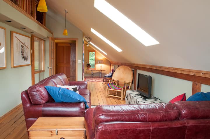 The main floor of the barn has been preserved in its original, functional state and was designed to accommodate horses (there are currently no domestic animals on the property). A short staircase leads to the private loft unit above. The door is typically open for your convenience, with the keys located on the kitchen counter.
