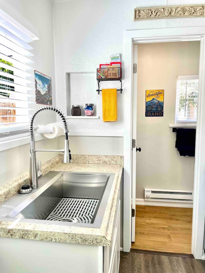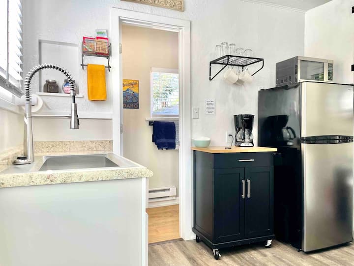 Escape to your Cozy Studio Cottage in the heart of Twin Falls! Well appointed amenities make this small space live large. Ideal for solo travelers or couples. This comfortable haven blends modern convenience with a touch of nostalgia. Enter in through the front door to be greeted by a well-appointed KING size bed with comfortable linens & pillows. Enjoy a kitchenette setup for light meals. Spend evenings surrounded by solar lights in the quaint shared yard or explore downtown delights, just a short stroll away. Complement your stay w/ free Wi-Fi, private parking & easy access to local landmarks. Book your memorable retreat now!