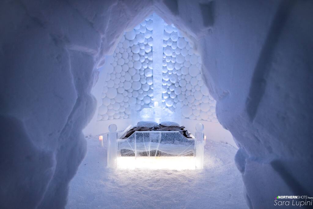 An exclusive magical adventure awaits at Tromso Ice Domes. The highlight of your once-in-a-lifetime winter adventure is staying overnight in the only room of this ice masterpiece, meaning you have exclusive use of this 400 m² ice hotel. A private guide will be at your disposal from the moment you arrive at Tromso Ice Domes until you depart the following morning. You will sleep in expedition sleeping bags on a comfortable mattress covered by reindeer skins.