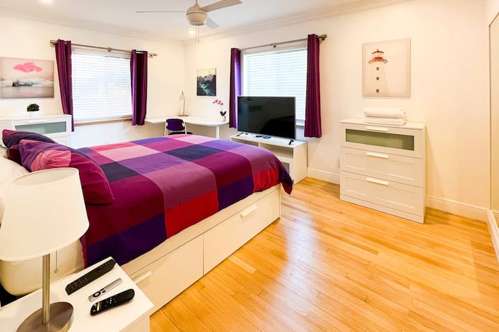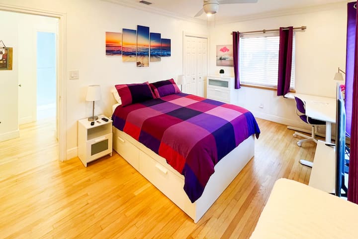 You'll be staying in your own private luminous bedroom, with private bathroom, queen size organic mattress & bedding, blackout curtains, 55" TV and your own dedicated desk/workplace while having access to all common areas.