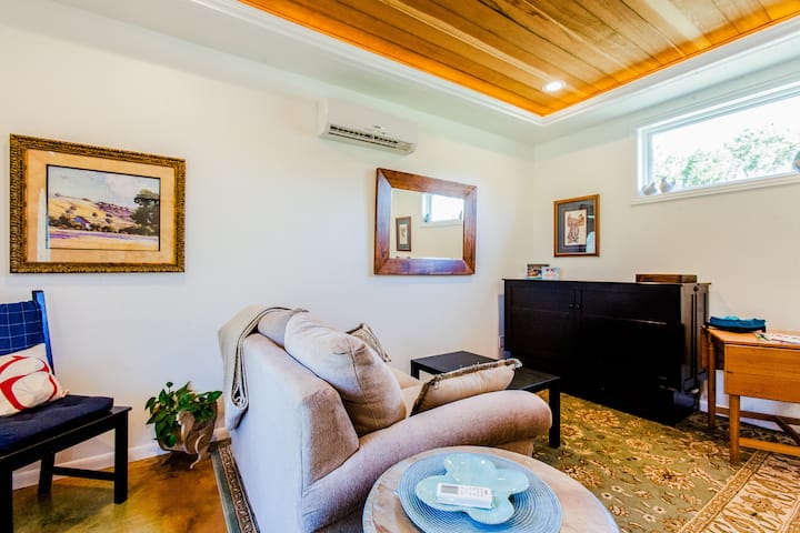 This beautiful cottage is constructed with comfort and relaxation in mind. It is located in the Hill Country - Wimberley Valley in Texas. This is the second cottage of two located on the Vintage Oaks Farm property. It has a great little kitchen with everything you need to cook or entertain friends. There is a large bathroom with a walk-in shower with a rain head and rain water! The bedroom has a queen bed that is very comfortable. The living room has a queen size Murphy Bed.