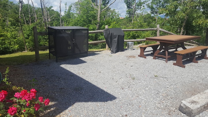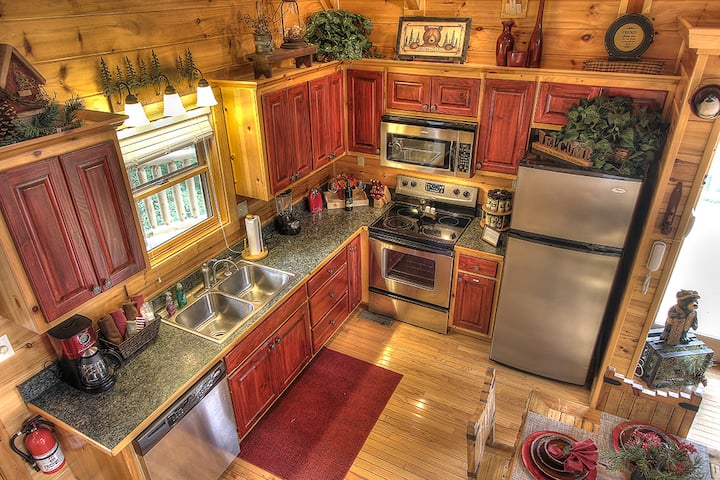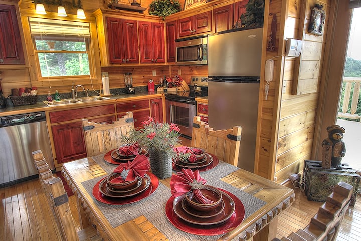 We chose this location because of its solitude and convenience to all of the attractions, restaurants and shopping. This two story custom built cabin has so much attention to detail you'll never want to leave and the mountain views will capture your heart! The cabin setting is quiet with the only noise being the Dollywood train whistle and local wildlife going about their day. The cabin is surrounded by woods on all sides, except of course for the clearing of the view. This cabin does not sit on a cliff and there is plenty of space to walk around. It sits on a 1/2 acre lot giving the kids a chance to go outside and play. It is on a private cul-de-sac with very few other cabins. You avoid the feeling of being in a development with so many other cabins close together surrounding you. The only congestion you will find here is on the Parkway and we have many suggestions as an alternative. You have seclusion while still being in the middle of it all at the same time. You come to get away and enjoy the mountains so why not with a little peace and solitude. The moment you arrive the memories will begin.