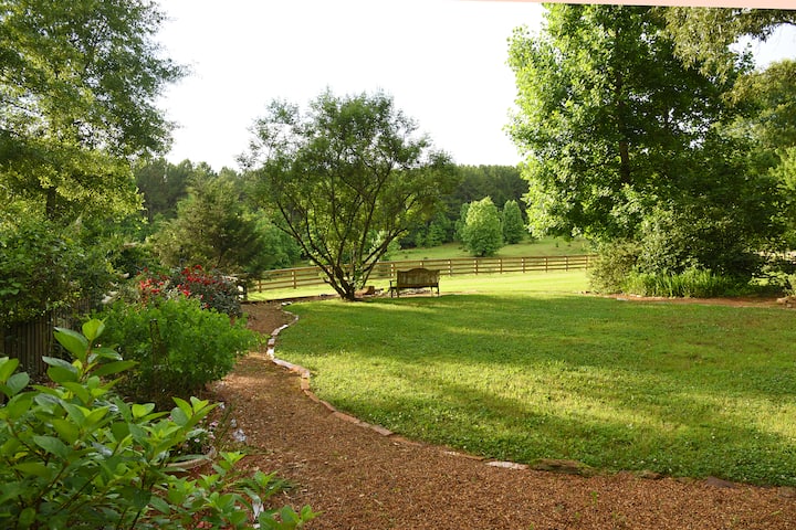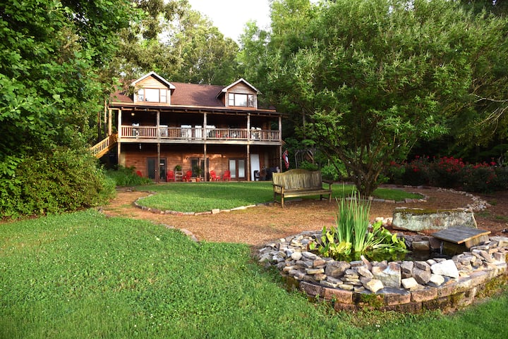 Oak Ridge Lodge has the look and feel of large mountain retreat, surrounded by lush woods and situated on 20 acres of private property, perfect for a quiet getaway with family or friends. Unlike many “rustic” style properties, however, the space has been recently renovated and features modern amenities, ensuring that guests won’t need to give up the conveniences of home. Its location, just over the Oglethorpe County line and a 12 mile drive from downtown Athens, makes it a perfect spot for visiting football fans, allowing them to stay outside of the traffic and crowds of game days but close enough to quickly and easily drive in to tailgate and go to the game. The same goes for anyone looking for a place to stay when traveling to see a concert at the Georgia Theatre, going to Athens’ annual cycling event, the Twilight Criterium, or attending a conference or other event at The Classic Center. It's also exactly one mile from Cloverleaf Farm, a beautiful site where many weddings and events are hosted, including the Wildwood Revival music festival!