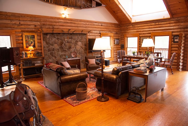 The Oak Ridge Lodge is a three story log building. It includes 4 bedrooms, with king, queens, and twin beds (sleeping for 12), 3 full bathrooms, 2 kitchens, and 3 living rooms, a hot tub, and a 400 square foot front porch perfect for watching the sun set over a beautiful view of the pasture. It includes wireless WiFi and 3 satellite TVs; lawn games and a fire pit are available for guests. The bottom floor (Bulldog Suite) can be rented separately upon request. Amazing building and grounds!