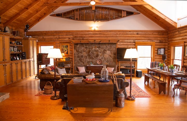 Also off the great room is the front porch, a 400 square foot porch the full length of the Lodge at the front of the building with a dining table and rocking chairs that has a overall view of the property - a lovely place to sit and watch the sunset. A set of stairs on either side of the porch allows access to the front lawn.