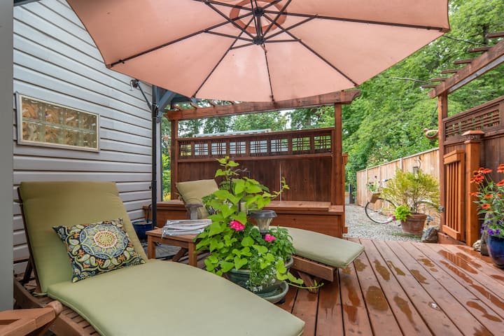 You are renting a bedroom guest suite suitable for 1 - 2 adults or 1 adult & 1 child over the age of 12 in a separate wing inside our home with private deck in our renovated 1930's Cottage. Located 2 blocks from the Tualatin River access. Bring your kayaks, canoes, paddle boards & bicycles along. Full size bed (not queen) with luxurious bamboo sheets, soft towels & bathrobes await your arrival along with seasonal heated floor in your private bathroom. During summer months you may relax on your private outdoor entry deck with fireplace, 2 chaise lounge chairs, shade umbrella over a table for 2. Outdoor folding chairs & beach towels may be borrowed for visits to the river or a park. Your suite offers A/C in the summer & a heated blanket in the winter. A fan, white noise machine, DVD/CD player & ROKU are provided in your bedroom with a selection of DVD/CDs for music, movies, yoga & lecture series. High download speed 955 mbps wifi & 2 laptop tables for your business or entertainment online. Your room has a surge protector charging hub & a UV sanitizing station for your masks, keys & phone. Your room is in a wing on the opposite side of the cottage from our family living area providing you with privacy. The window behind your bed faces unused land with the occasional view of a deer, plenty of birdsong and sunshine. The price listed is for 1 person, please change guest number to a 2 if traveling with a companion. Vegan packaged breakfast snacks and cold beverages/protein drinks are complimentary in the room. Coffee & Tea are available 1 mile away at the Country Store on Stafford Rd, next door is Dubs Tavern with full bar and restaurant. We do not include the use of our kitchen, no coffee provided, no laundry privileges. We are a pet & fragrance free home. Plan on eating all meals out or Vegan delivered meals on your deck table. Please do not bring non-Vegan outside food onto the property or into the room. We provide a micro sized refrigerator for medicine storage & complimentary cold beverages and Vegan snacks and breakfast bars. We HIGHLY recommend YOU HAVE A VEHICLE during your stay. Please inform us of any allergies you have before checking in for your safety.