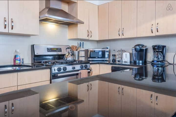 Feel like cooking a big dinner or entertaining in a dramatic, wide open space? The main living/dining/kitchen area is approximately 1500sf on its own. The modern kitchen with Stainless Steel appliances, gas stove, refrigerator, dishwasher, plates, utensils, substantial counter space and breakfast bar and big dining room table that accommodates 12.