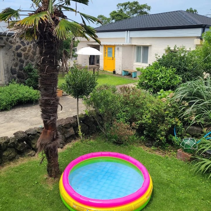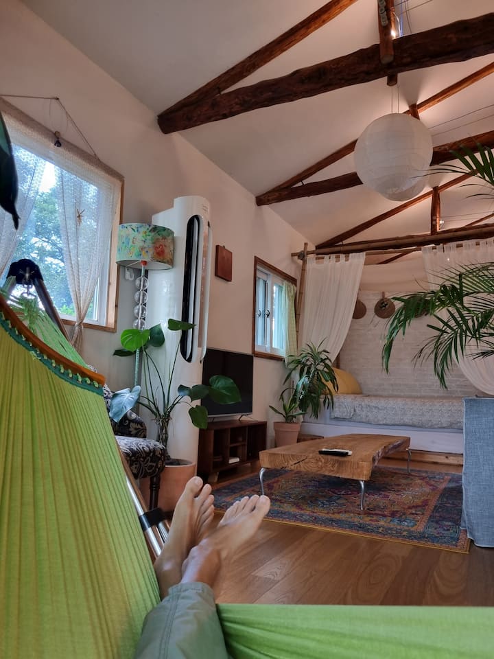 This is a 25-pyeong private pension that is cool in the summer and warm in the winter, with a Jeju-like feel. The hot water works well, and I paid attention to the interior design. There is a private garden, hammock, loft, spacious living room, and parking lot, and famous tourist attractions are within 20 minutes. It is located in a neighborhood called Myeongwol. Guests who have visited the accommodation were satisfied with the interior design, high ceilings, spacious living room, and lighting.