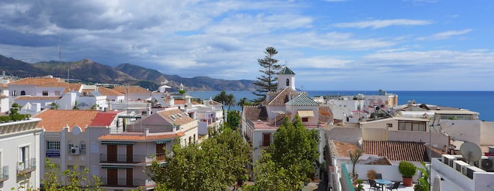 This smart four bedroom two bathroom flat takes up the entire top half of its apartment building on Plaza Cavana, which is the small square with bars and restaurants next to Nerja's emblematic Balcon de Europa. The apartment has private terraces with sea and mountain views, where you can sit and watch the world go by.