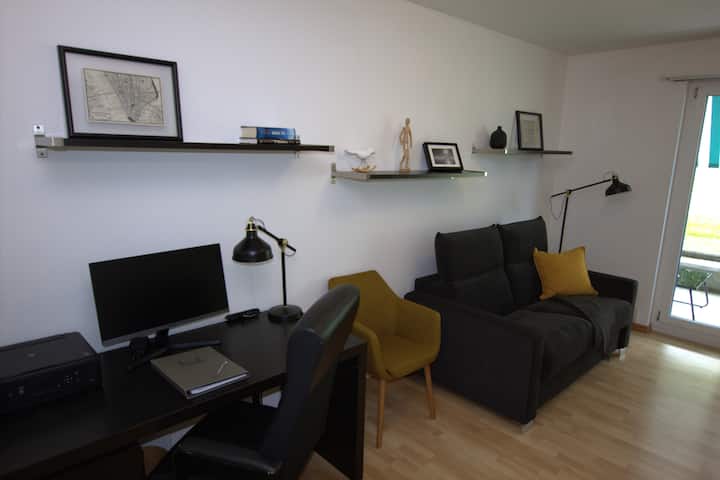 Office/ Guest bedroom: printer, sofa-bed, working desk and comfortable office chair. This room has access to the backyard. An extra single mattress can be placed on the floor next to the sofa-bed upon request (for a fith guest). When the sofa-bed is opened, it is 140x190cm wide. We recently changed the sofa-bed for a more comfortable option.