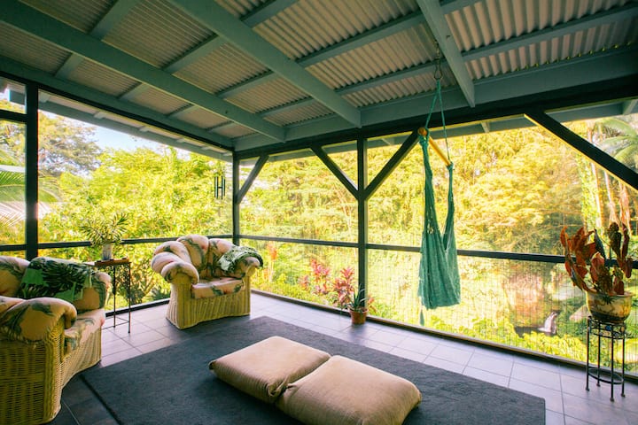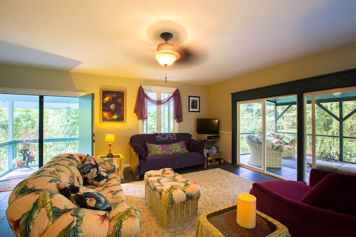 Many guests at Aloha Falls report that they simply had no desire to leave the screened-in lanai overlooking the jungle and waterfall. Meals are enjoyed in the kitchen, which also features stunning views of nature that surrounds you. You can hear the sounds of waterfalls, jungle frogs, and warm tropical breezes in every room of the house. These sounds are sure to soothe your whole being and bring to the peace of Aloha. You may even schedule an on-site massage, which takes place in the lanai, surrounded by the tropical rainforest sounds.