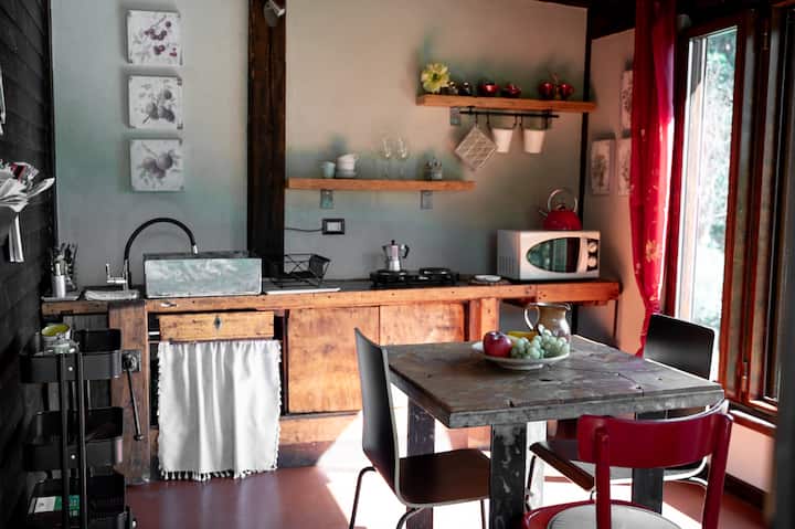 In the UNESCO territory of the Alps and near the Langhe, a charming small wooden house, located in a tiny 7-house hamlet, immersed in the woods.