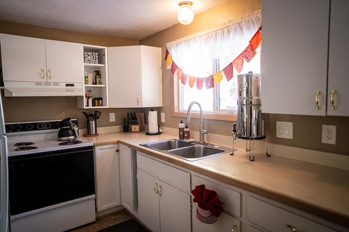 Fully stocked kitchen with Refrigerator, Electric Range, and Microwave. Views from kitchen sink of boulder hillside. Plenty of dishes, glasses and acrylic glassware, toddler dishes, baking dishes, pots and pans, cooking utensils for making your favorite (simple) meals. The kitchen is open to the dining area with a peninsula bar and stool.