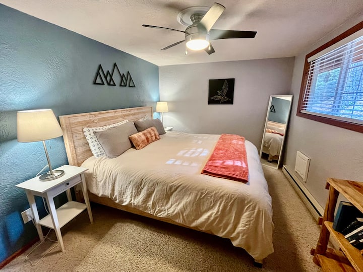 No A/C: Our nights are cool even during the warmest days. All sleeping areas are equipped with ceiling fans and cool down quickly with open windows, the setting sun, and our fresh mountain breeze. A/C is not the norm and seldom needed as Estes Park is a mild mountain climate and during the summer we are generally 10-20 degrees cooler than the nearby lower elevations of Colorado. Usually in the 50s at night in summer months.