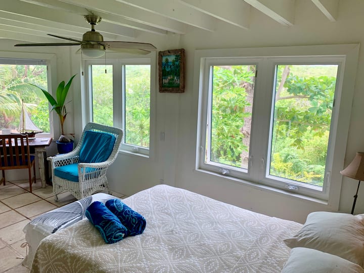 Everyone was a bit skeptical of this young woman clearing the land by herself and building a house with no electricity, running water, car or a telephone. Camping out every night on the site helped her develop an intense connection with the land and gave her the opportunity to build a house that was perfect for the location. She decided to build 11 foot arches on all five sides of the house to allow the ocean breeze to sweep into the house. She nestled the house among coconut trees and Casuarina trees where you can hear the sound of the wind in the trees and the waves on the beach. She surrounded the house with a garden full of beautiful hibiscus, oleander, seagrape, coconuts and other native flowers and trees.