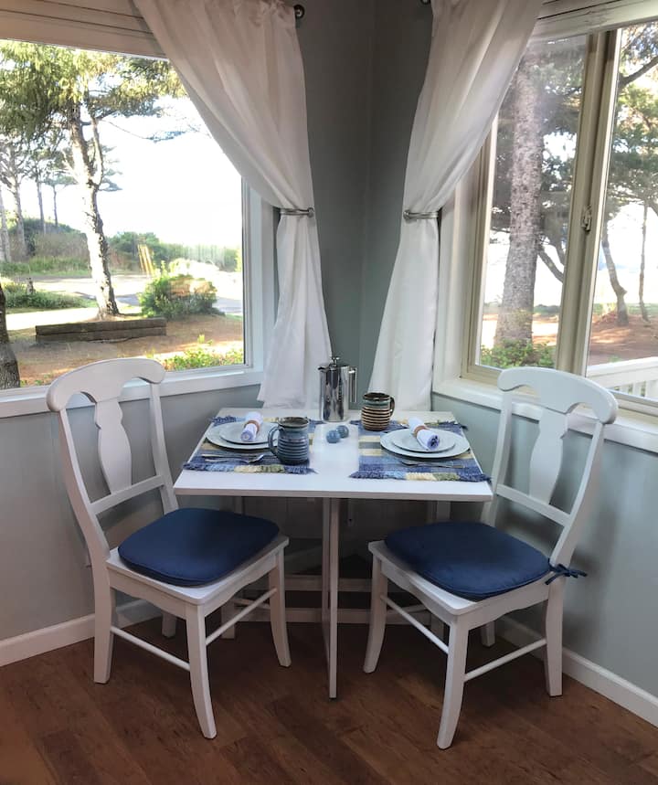 Enjoy the tranquil view of the Pacific Ocean from the comfort of the living room or while relaxing on the oceanside deck, with prevailing ocean winds mitigated by a sheltering grove of spruce trees.