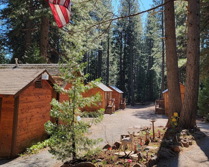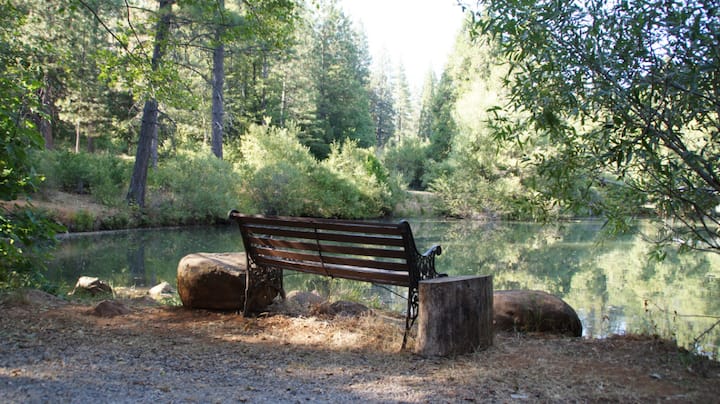 Welcome! We have cottages (some with hot tubs), cabins, a tiny house park model, teepees, bell tents late model RV trailers, camping spots and RV spaces for rent on 19 acres next to a small lake and year round creek at Bigfoot Lodging (formerly known as Living Springs) in Shingletown CA.