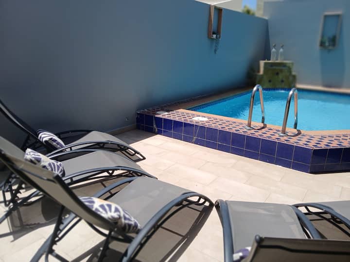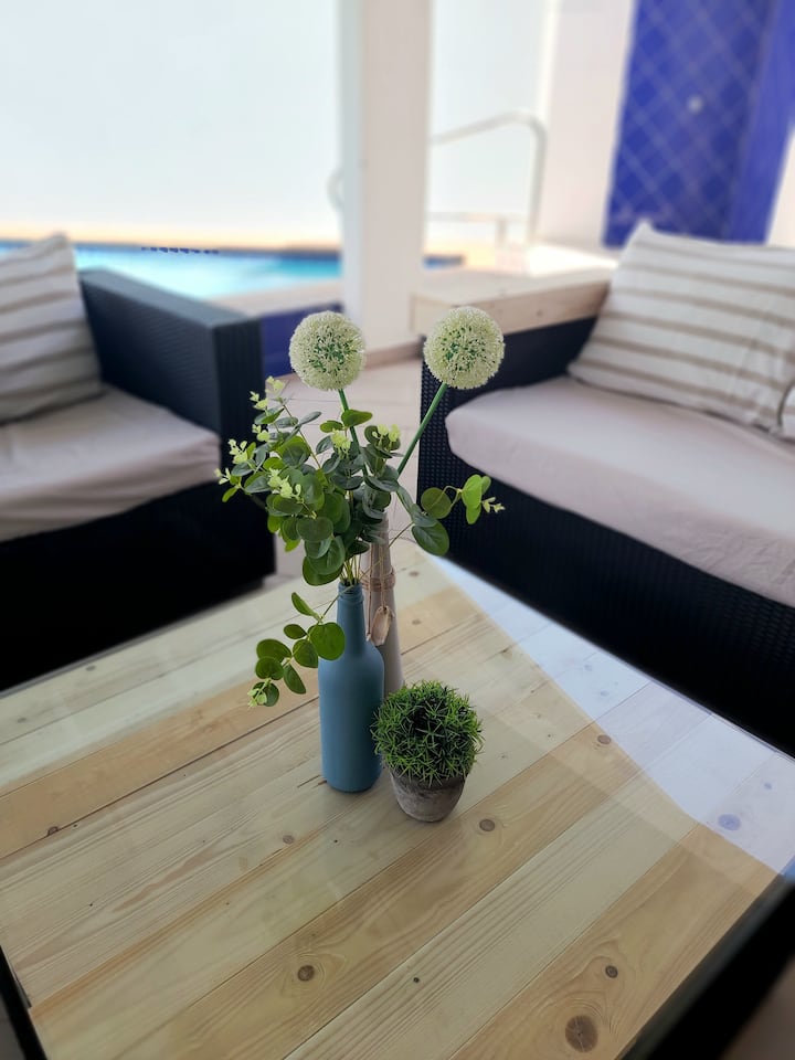 This beautiful villa is spaceous and modern. The living area with large sofa is large and comfortable and completely air conditioned, and is connected to the kitchen. We have a large dining table and another sitting area to watch TV. Large glass doors give the home great light and a connected feel with the outdoor space. The sitting area on the patio is great, lounge chairs, dining table, outdoor kitchen, a sofa on the patio, a BBQ and of course a beautiful swimming pool. An outdoor shower to complete things. All it needs is YOU on a float!