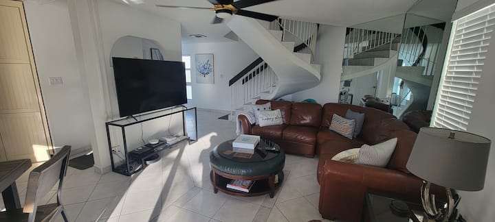 Centrally located directly on world famous 7 Mile Beach. Relax on one of our resorts many private beach loungers. Our two level vacation rental features 3 bedrooms and 2 bathrooms with beautiful views of the pool, gardens and a glimpse of the beautiful Caribbean Sea from both the upstairs and downstairs balconies. This unit has an open concept, living, dining and kitchen space, which is perfect for evening get togethers.
