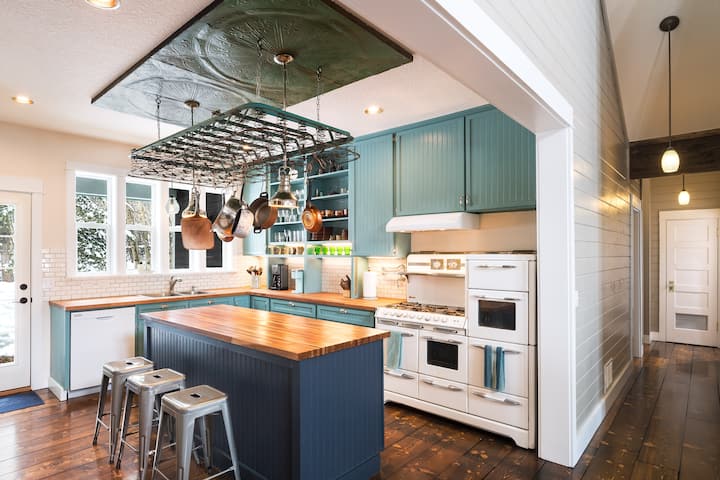 The farmhouse kitchen is flanked with a wall of windows above the sink looking into your treed oasis. Butcher block countertops accent the kitchen island where memorable home cooked meals are waiting to be prepared. The pride and joy of our cabin is the antique O’Keefe & Merrit 1950s gas range and oven. Its six burners, two ovens, two warming trays, and broiler is one of an estimated 300 to still be in existence. It can definitely handle all your cooking needs for a large group or romantic dinner.