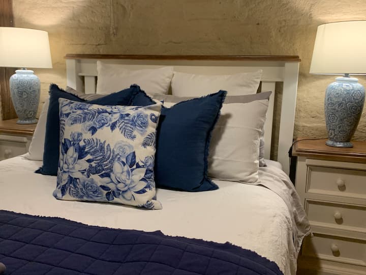 ‘The Homestead @ Glenwood’ has two internal living spaces (one with wood fireplace) and the Hamptons inspired north facing deep verandah with plenty of alfresco living to enjoy, giving you the feeling that you could be in the middle of Provence’s wine country taking in the serenity of the lake sparkling in the sunshine. Interior designed to create a country style accent on Hamptons style charm, the main living area enjoys a 3-seater country style couch and a 50inch TV (set-top box and DVD player), a provincial style dining table for 8 and a breakfast bar for 4 in the well-equipped kitchen. The second living area has two sitting areas – one in front of the 80-inch smart TV, the other in front of the wood fire, plus there is a dedicated desk if you need to do some work or study during your stay. You’ll be spoilt for coffee choices with a Breville coffee machine, French press, and instant coffee in the kitchen, plus lots of condiments, herbs and spices and supplies for you to use. The four bedrooms (three queen size beds and one king single bed) on the north side of the house all have access to the verandah. There is one bedroom with a private ensuite and all the bathrooms remain in their neutral retro authenticity while kept immaculate for today’s needs. The laundry has been renovated to bring the farmhouse style into the home, allowing all the storage to be in one place. All the rooms have been thoughtfully decorated to feel plush and inviting, giving a sense of relaxed country pride. The house is air conditioned in the living spaces, ceiling fans in each bedroom, and we provide individual heaters to the bedrooms in winter.