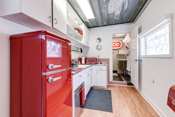 Tucked away behind our main house, you have complete privacy! Enjoy the nice full-sized shower in the retro-tiled bath that comes complete with hair dryer, soaps, lotions, shampoo and conditioner as well as a clothes steamer.