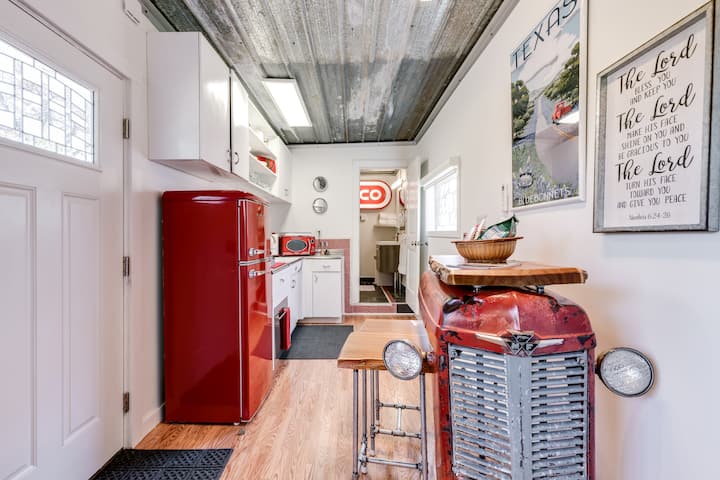 In the kitchen, enjoy the classy, vintage metal cabinets, retro-styled microwave and fridge, great smoothie blender, instant-pot, induction cooktop, ZeroWater filter and dishwasher. A Nespresso machine and pods are set out for your enjoyment or, if you prefer, there is a coffee grinder, organic beans, and french press available. Everything is brand new (except the vintage cabinets) - including the dishes and utensils. There are grocery stores close by but if you like to eat out the Unique Dining Capitol of Texas (Roanoke, TX ) is just a few miles down the road.
