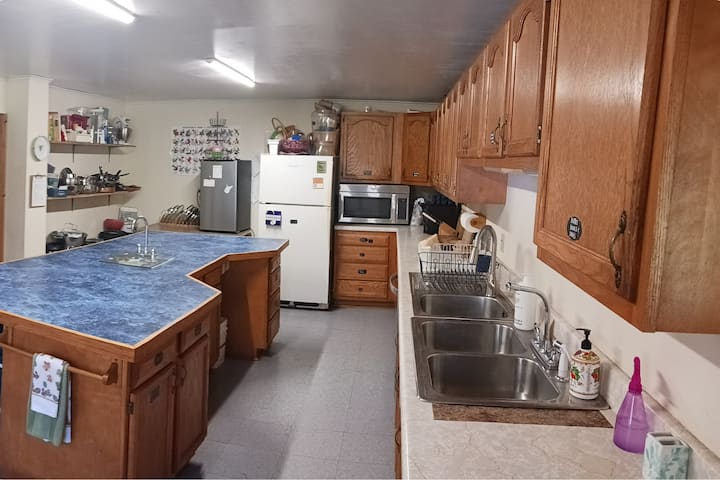 The lodge has excellent cooking facilities, featuring a main kitchen with a full-size refrigerator and a complementary smaller fridge in the kitchenette. We provide a Viking 6-burner gas stove and oven, two microwaves, two toaster ovens, a coffee maker, a toaster, a hot plate, and an electric hot water kettle. The kitchen is fully stocked with many pots and pans, casserole dishes, and multiple sets of silverware, plates, and bowls.