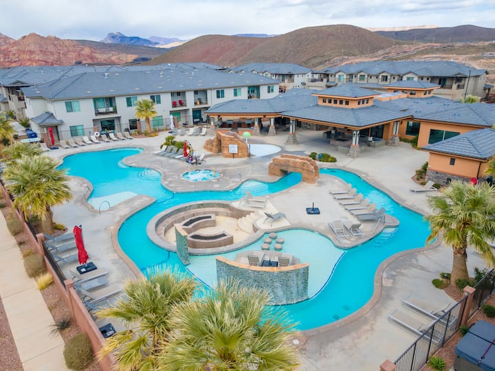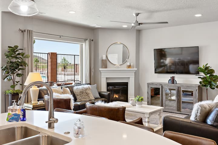 7BR lux townhome 30 mins. to Zion NP! Pool heated all year! Private hot tub; pickleball, spectacular views! Sleeps 20+ Perfect for large families. Next to pool with slide, lazy river, clubhouse. PS3, Hulu Live, 6 flat screen TVs, arcade & pinball games, & Ping Pong. 5 bdrms w/ king beds. 2 more with bunks sleeping 10 more. Wal Mart 5 mins away. Meal seating>20. Free NEMA 14-50 EV charging (bring your own cable)! Explore Greater Zion! Also see our property across town: https://abnb.me/BrvvKwvZ0Fb