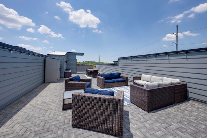 This 4-bedroom, 4-bath home sleeps up to 12 guests across 10 beds and boasts a massive rooftop deck with jaw-dropping 360° downtown views. Inside, enjoy hotel-quality linens, ensuite bathrooms for every bedroom, a chef’s kitchen with high-end appliances, and entertainment features like a digital karaoke machine and classic arcade game. You’re an easy Uber to Broadway, Music Row, and all of Music City’s hotspots.
