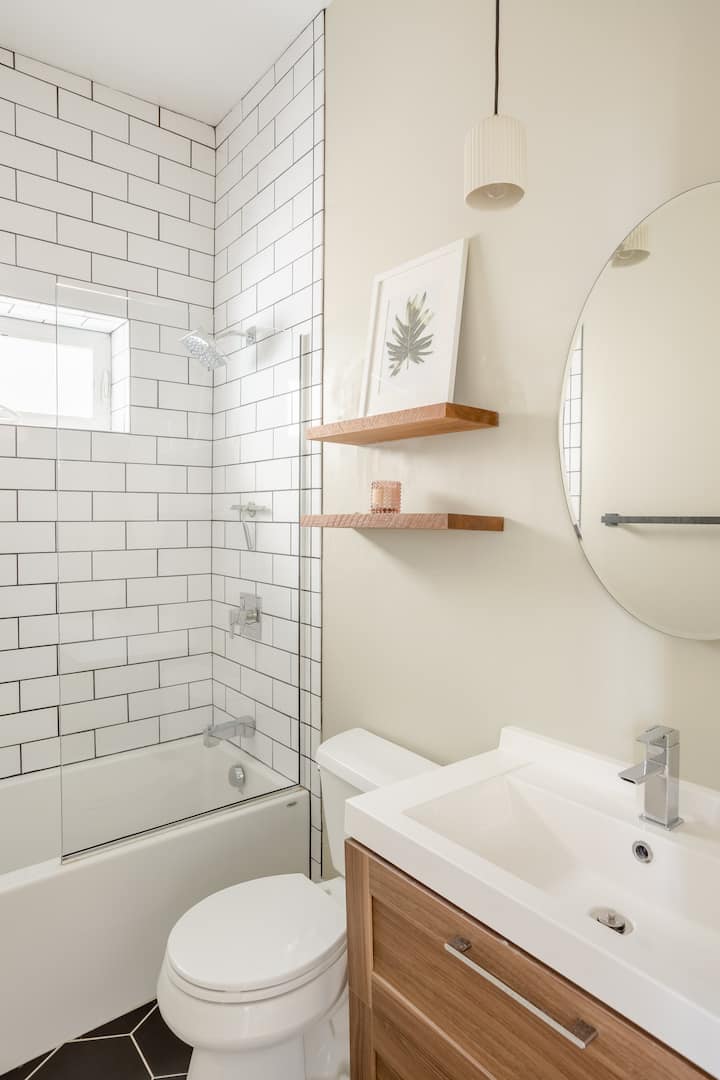 Step into a soothing space in this inviting guest apartment. The space features an open-concept living area and kitchen, a repointed brick masonry wall, contrasting dark surfaces and stark whites, bright wood flooring, and eclectic furnishings.