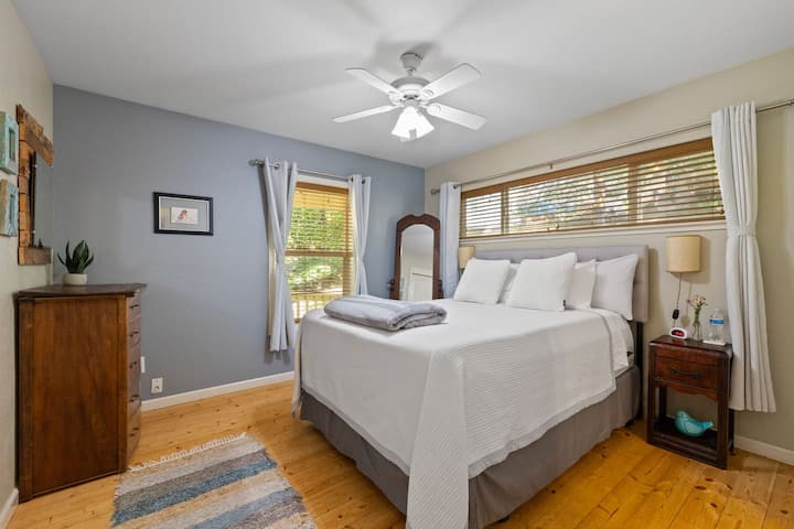 The room-darkening shades and extra bedding are loved by guests.