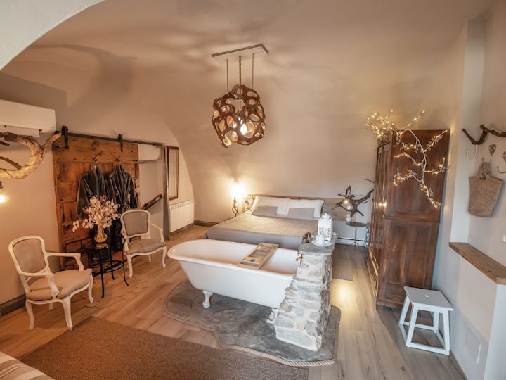 • ROMANTIC BEDROOM: The highlight is the large bedroom, featuring the restored, antique bathtub. Indulge in a relaxing bath while gazing at the surrounding woods with a glass of good wine.