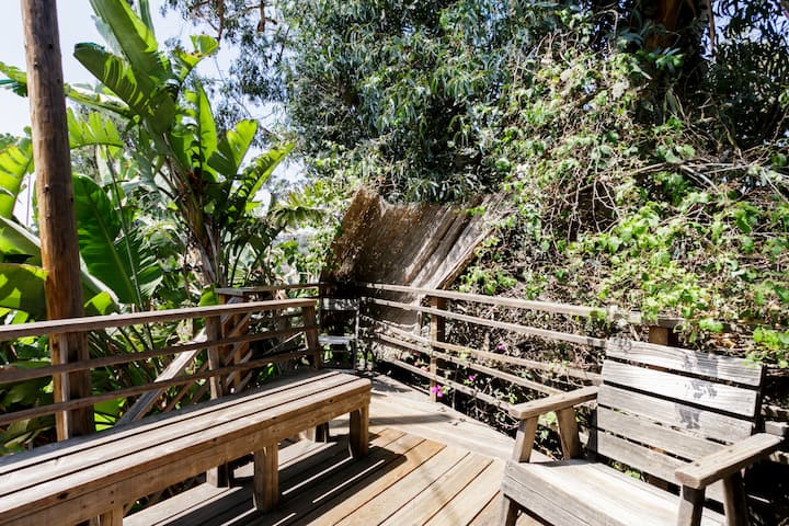 You may access the exterior day bed shown in the photos and outdoor shower on the walkway up to the guest unit. The guest unit is at the rear of my home with complete privacy. The outdoor shower is shared with the main house. Guests have their own private entrance and exit to the shower from the guest unit.