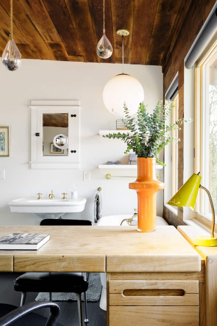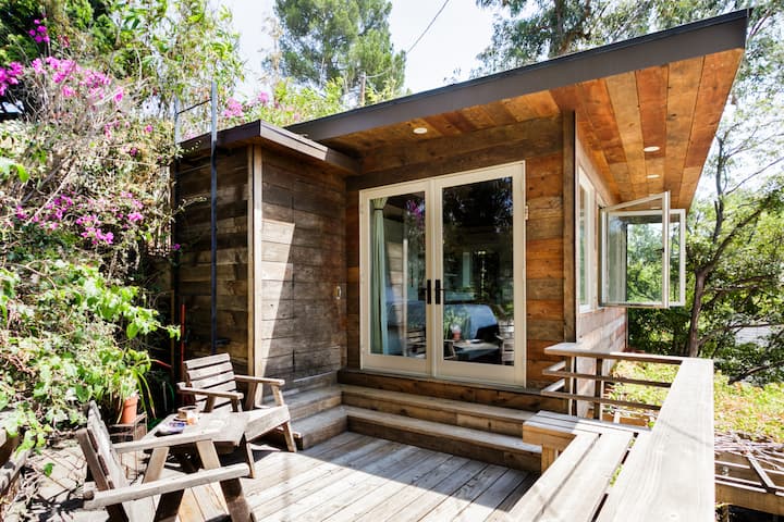 Drink in panoramic city views from Hollywood to the ocean from the freestanding bathtub at a private guest unit nestled in the wooded hillside. Wake up in the cabin-like bedroom and step out onto the sun-drenched terrace for a cup of coffee or tea.