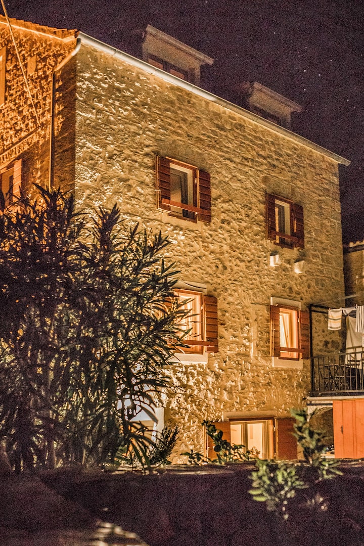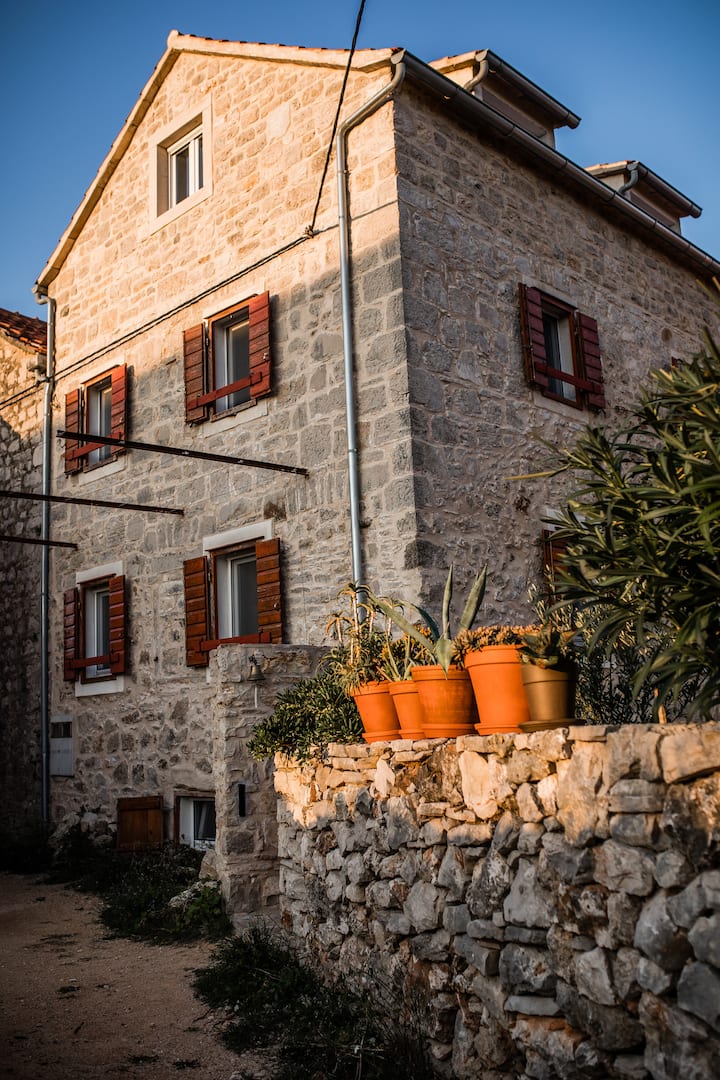 An ancient 4-floor stone house, tastefully renovated, in too-die-for cute Mala Rudina, a tiny village at the end of the track by Stari Grad. It's a 15' walk on a trail bounded by ancient walls to a charming cove for repose and recreation. The house is ideal for families and groups of friends, and is equipped with everything you'll need inside and out: toys, bikes, kayaks, paddleboards, snorkeling gear, etc. *If you are a smaller group, let us know: We have a house for 8 and a house for 4 too.*