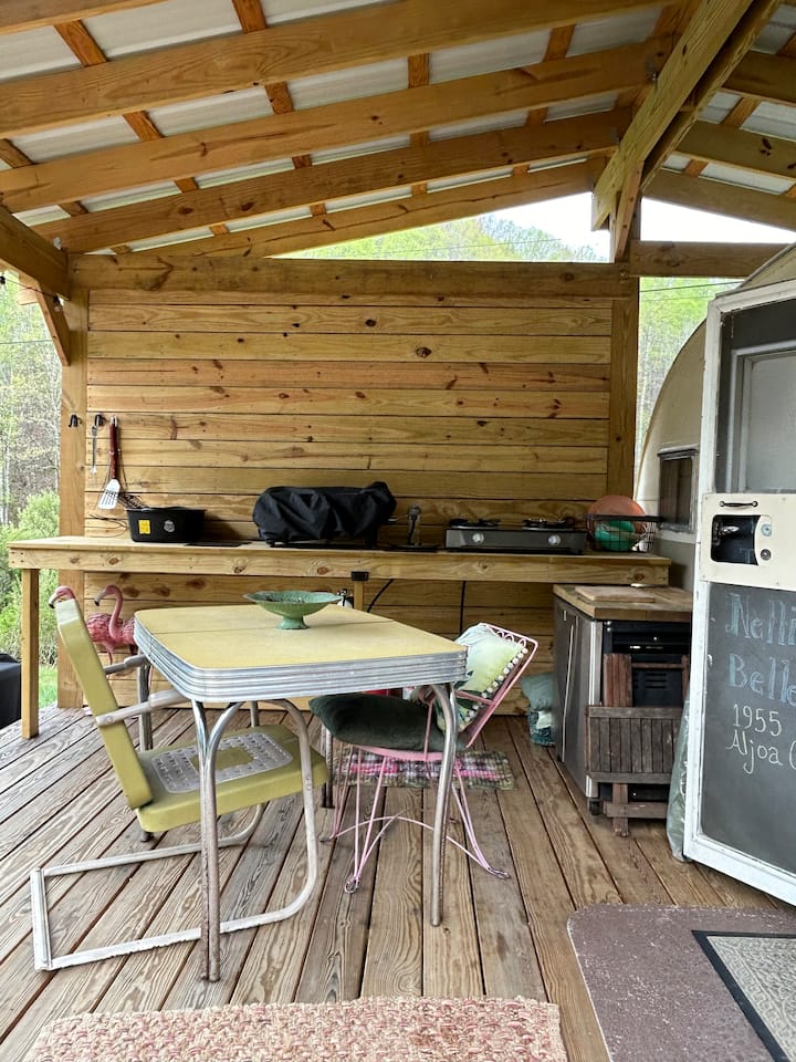 Blackberry Blossom Farm is often referred to as " A magical place, BEST Airbnb we've ever been to!" The Nellie Belle vintage 1955 Aljoa Camper overlooking the Unaka Mts. is cute as a button!