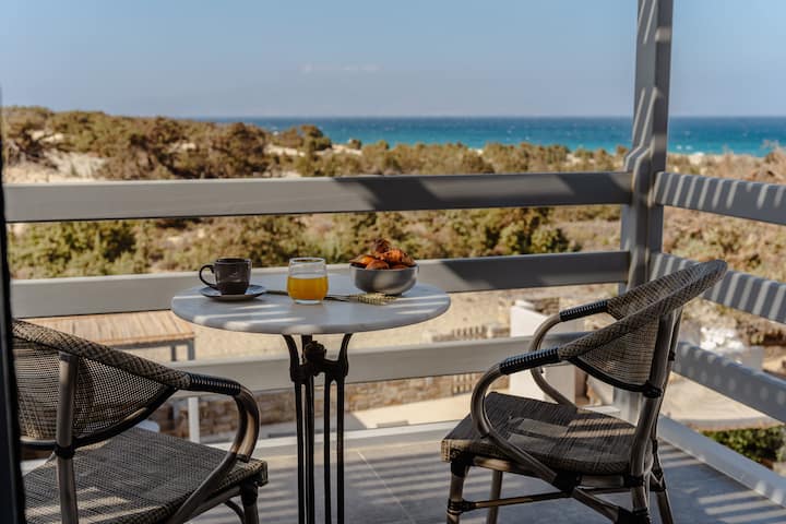 This quiet part of southwest Naxos puts you close to everything yet blissfully away from crowds. Walk to postcard-calm coves and dunes; drive a short distance to Pyrgaki, Mikri Vigla, and Plaka for kitesurfing, tavernas, lounges and trendy beaches. You can reach Naxos Town’s shops, port, and castle in about 30 minutes. You also have the option of day-trips by boat to nearby Koufinisia or Paros. Popular islands like Santorini and Mykonos are all possible to reach in under an hour ferry ride. If you feel like exploring there are incredible historical sites such as the Ancient Temple of Demeter, marble Kouros of Melanes, and the infamous Temple of Apollo.