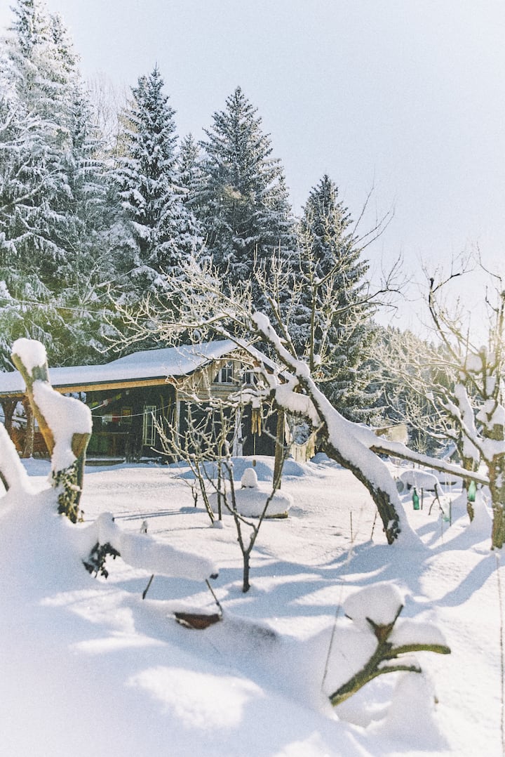 The barn is not insulated and therefore has 2 thermal protection curtains: one at the entrance area and one to separate the living area around the stove. The front part of the barn, where the kitchenette is located, is only heated indirectly. Of course, the barn also heats up completely through the stove, but the kitchen area / entrance area and the sleeping floor only get moderately warm. The living area with couch, table, armchairs and piano is cozy and warm even at -10 degrees, but the stove must be stoked all day. Continuous heating of the stove in winter is therefore important. Wood briquettes are available for the nights or day trips, so that even through the night or in the absence, the embers never go out.