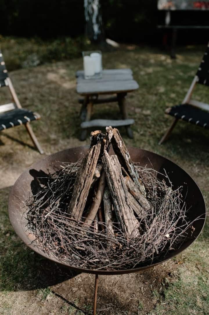 Wake to the soft light filtering through the trees, their silhouettes dancing in the morning breeze just beyond your window. The air carries the scent of native blossoms, mingled with the sweetness of orchard fruit and fresh herbs from our ever-evolving garden — a space we lovingly tend, where creative projects are always blooming.