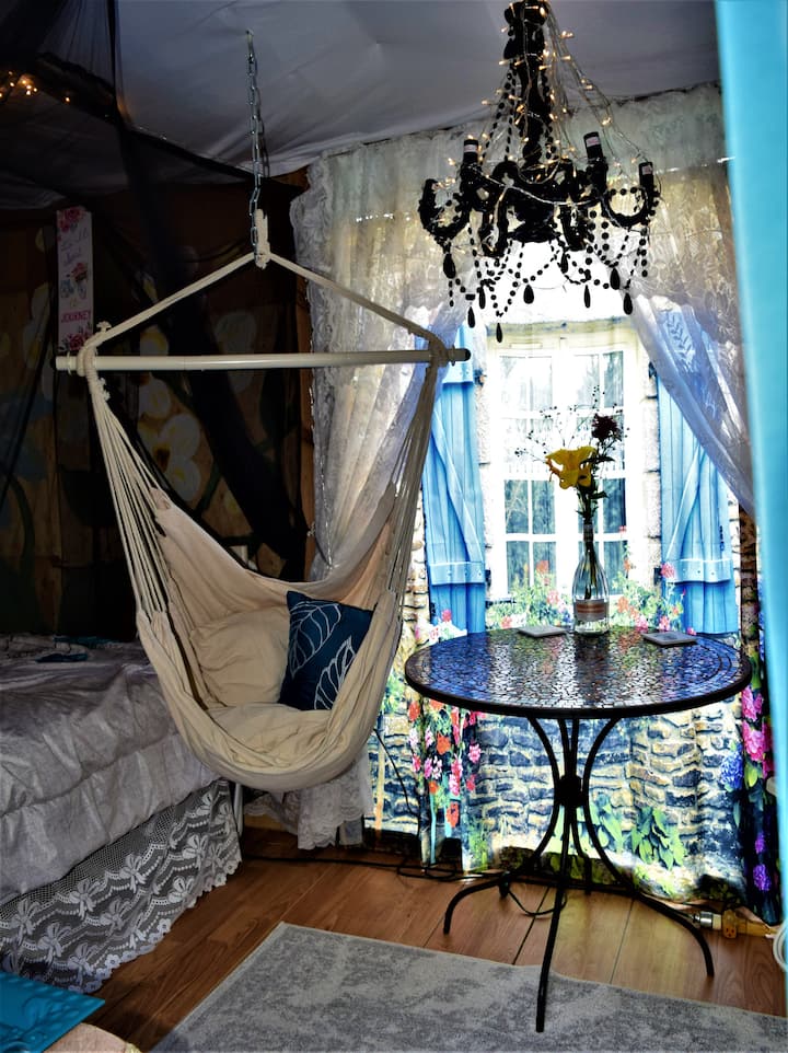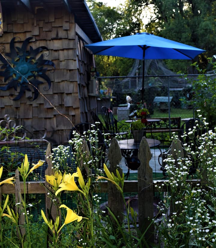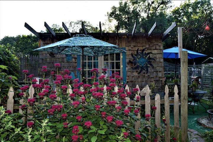 The Garden Glamping Cottage is an eclectic and artsy space (one of four units on the property). A healing refuge of tranquility nestled in the gardens. The 8'x16' "large wooden tent" features a cozy queen sized bed (BYOBedding) with a super comfortable mattress to nestle up in. It has its very own fenced yard landscaped with edible and medicinal plants in ground and in containers. It is a nature filled space with a full view from inside of my Rabbit Village (bunnies and chickens. Shared flushing outhouse, no running water in the unit. Shared outdoor Community Kitchen.