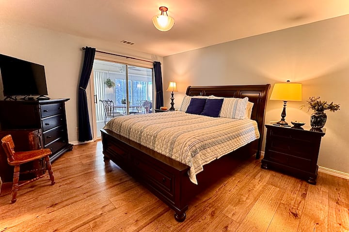 A king bed in the guest room is a new addition with cotton sheets and blanket. Extra blankets and pillows. Smart Roku TV. Easy access to the second bathroom.