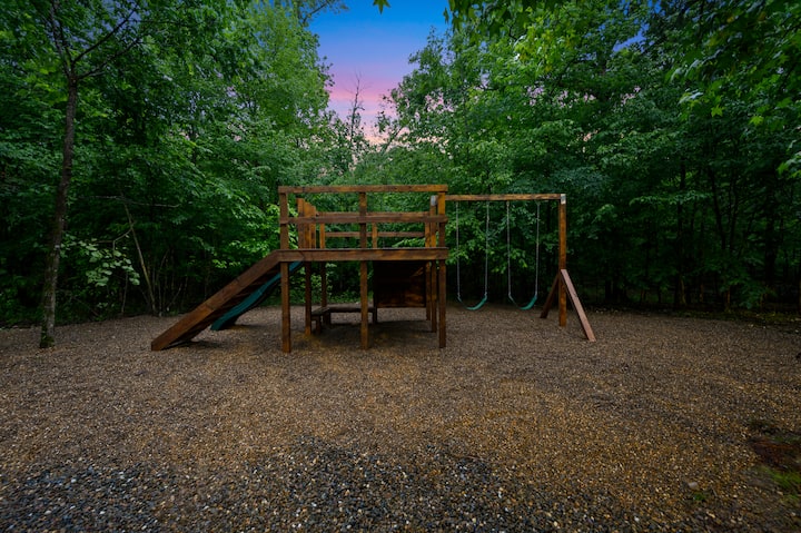 Venture off the deck to find a landscaped area dedicated to outdoor activities and relaxation. Gather around the fire pit, settled in comfortable Adirondack chairs, perfect for sharing stories or enjoying a peaceful evening. Engage in friendly competition at the horseshoe pit or cornhole board, among other outdoor games provided. You will also find a playscape for our younger guests! The Regal Eagle's outdoor spaces are thoughtfully designed to create unforgettable moments and enjoyment for guests of all ages.