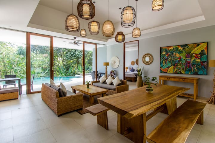 The living area is my favourite place in the house. No air conditioner (but we have 2 ceiling fans), because is open, breezy and really beautiful. We have a very large 2.5 long Solid wood kitchen table with enough seating for 8-10 people. All the furniture has been handmade and designed exclusively for our villa! There are two large couches which are ideal for relaxing and enjoying the beautiful views of the pool and jungle valley beyond.