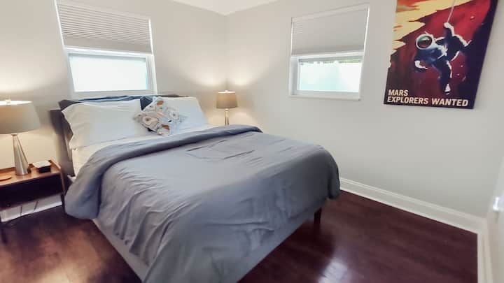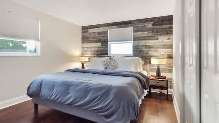 • Bedroom One offers a King-sized gel memory foam mattress, cloaked in luxurious linens and room-darkening shades that ensure true rest. The Smart Roku TV, mounted across from the bed, whispers of late-night dramas and lazy morning cartoons. There’s a charging station in every lamp — useful, yes, but also subtly thoughtful.