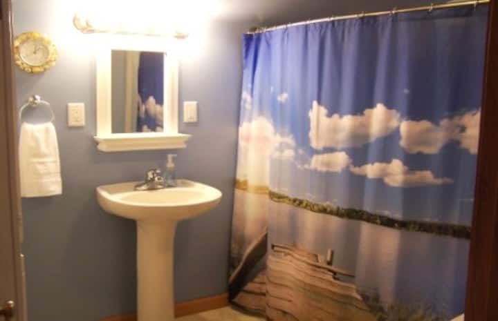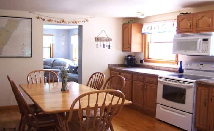 4 Season Charming Nautical Themed Cottage! Very clean and generously outfitted with amenities! It's secluded & nestled next to the woods across the road from the Bay of Green Bay. Although meals are not provided - you can have fun creating your own in the spacious kitchen outfitted with just about everything but the food!